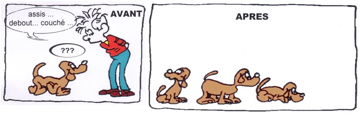 Il faut utiliser toujours les mêmes mots pour les mêmes ordres. On dira : « assis » quand on demande à un chien de s’asseoir, et pas une fois « assis », une autre fois « sur tes fesses », une troisième fois « assieds toi », etc…